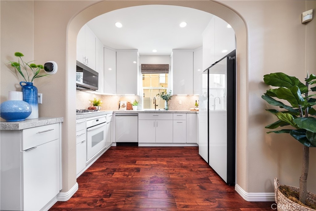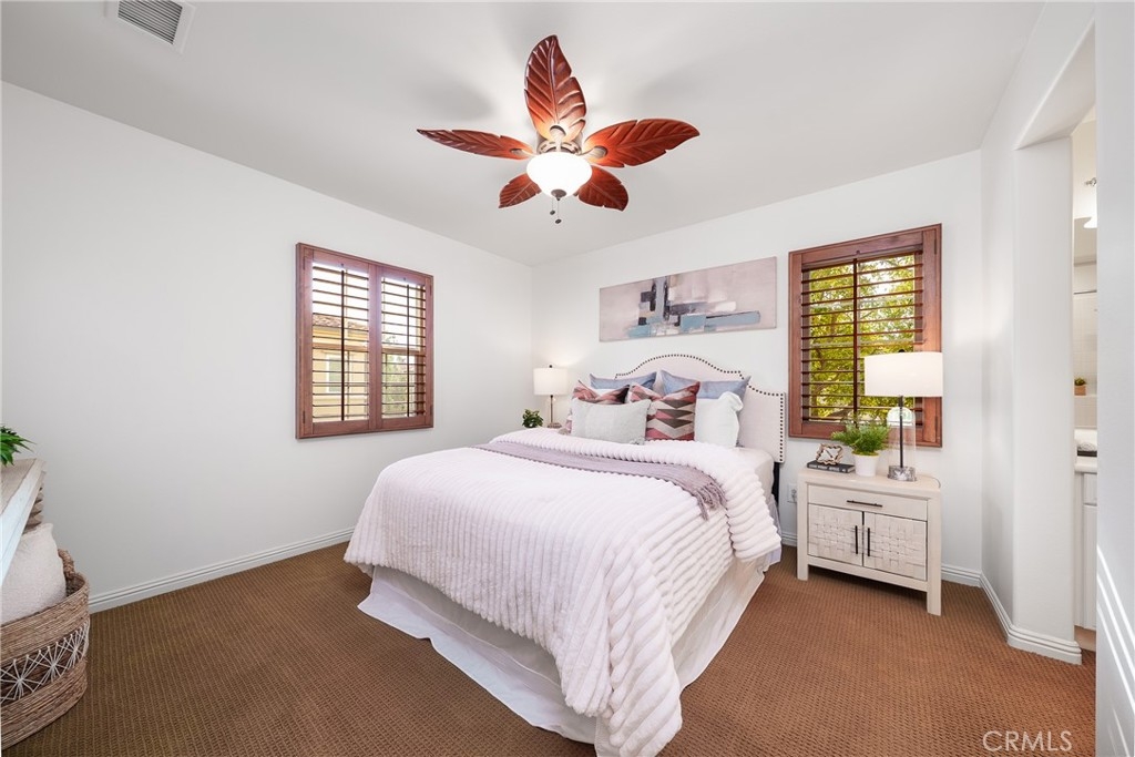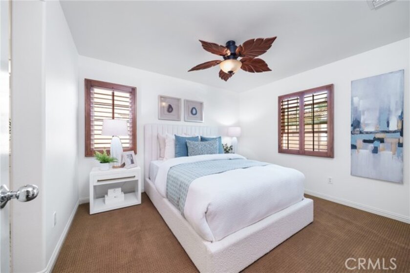 Beautiful Corner Lot Home with Dual Primary Suites in Woodbury, one of the most desirable communities in Irvine. This stunning corner lot home radiates pride of ownership throughout and offers an exceptional blend of comfort, style, and quality upgrades. Featuring two primary suites, each complete with full showers and a solar tube in the primary bath with built in night light and spacious walk-in closets. This thoughtfully remodeled residence provides the perfect balance of luxury and functionality with spectacular views of the corner lot from almost every room. The first floor showcases beautiful Acacia hardwood flooring, while the second floor is complimented by soft Berber carpet. The remodeled kitchen is a true showpiece, featuring quartz countertops with a full-height backsplash, high-gloss white laminate cabinets with premium hardware, LED under-cabinet lighting with adjustable color settings, and modern conveniences such as a pull-out trash system, Super Susan tray storage, double knife drawer, new Kohler pull-down gooseneck faucet, Kraus stainless steel sink with rounded corners, and high end Samsung Bespoke dishwasher, refrigerator and microwave. A large walk-in pantry is located just off the kitchen, offering ample storage space. Additional home features include ceiling fans, window treatments that include Bass wood shutters, roller shades and woven blinds. as well as PEX piping throughout, new water heater, Brondell bidet systems in both primary suites with Kohler showerheads, Kohler hardware throughout the home including all faucets with metal drains and downstairs bathroom has a comfort high Kohler toilet. Technology upgrades abound, including hardwiring for internet (Google Fiber) in the great room, master bedroom and kitchen, as well as a TV wall mount in the great room, a hardwired security system, and a wireless garage keypad. The outdoor stone and pebble patio provides a peaceful, low-maintenance retreat complete with a gas BBQ outlet, Weber grill, and lush Triangle Palm and Ocotillo plants. Some of the energy-efficiencies include Milgard windows, fiberglass insulation between floors, and a roof equipped with a radiant heat barrier for added efficiency. This home truly combines thoughtful design, modern comfort, and timeless appeal—ready for you to move in and enjoy!