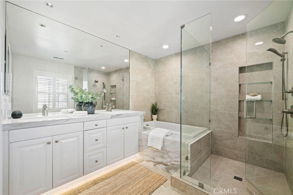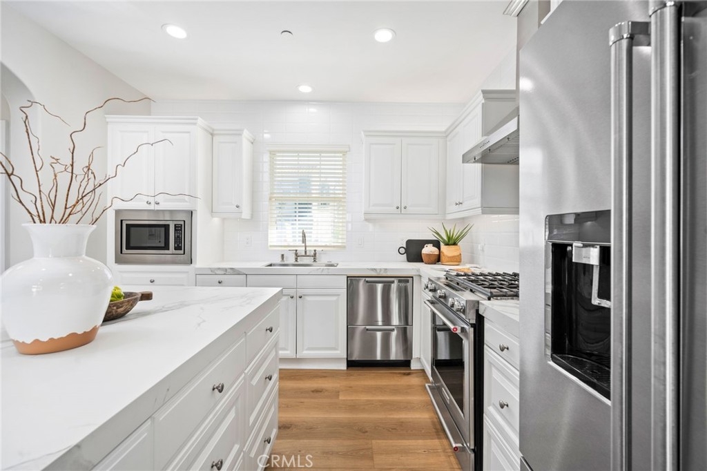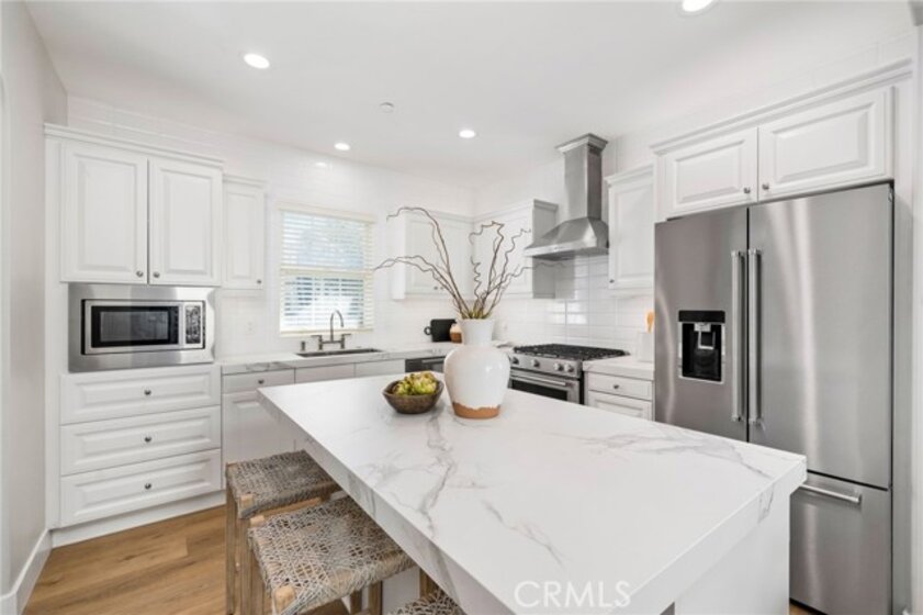 Prime location, stylish upgrades and effortless indoor-outdoor living! This beautiful home checks all the boxes with a chic new kitchen and bathrooms, entertaining options and fabulous neighborhood amenities. Welcome to Arborel at Turtle Ridge, a sought-after community within minutes of UC Irvine, beaches and shopping/dining hotspots. From the charming entry with designer paint and custom beadboard detail, or the 2-car garage, enter inside the bright and airy main level. Wide-plank hardwood type floors have been updated throughout. The reimagined kitchen showcases new quartz counters, high-quality stainless steel appliances including Fisher & Paykel dual dishwasher drawers, and a sleek backsplash complementing the all white cabinetry. You’ll love the flexible options provided by a breakfast bar center island and eat-in dining area, with French doors opening directly outside for dining and gatherings. Sunny and secluded, the paver patio is a private retreat right here at home. Light fixtures are upgraded throughout and every bathroom is beautifully remodeled, from the powder bath downstairs to two full baths above, each showcasing designer finishes and fixtures. All three bedrooms have direct access to a bathroom for ultimate privacy and convenience. Two secondary bedrooms share a jack-and-jill bath with double sinks and a large step-in shower, with a shaded balcony off the second bedroom. In the primary suite, enjoy a generous walk-in closet and spa-inspired primary bath with marble finishes, enlarged soaking tub, and a frameless step-in shower. Amenities at Arborel include a junior Olympic size pool and children’s wading pool, spa, clubhouse, and extensive nearby trails. All within minutes of the beach, freeways, local schools, and popular shops and dining. Welcome home!
