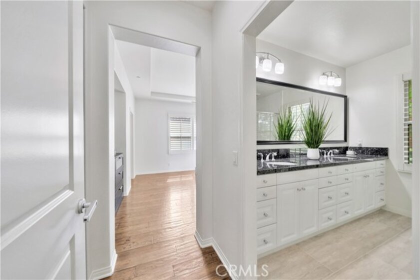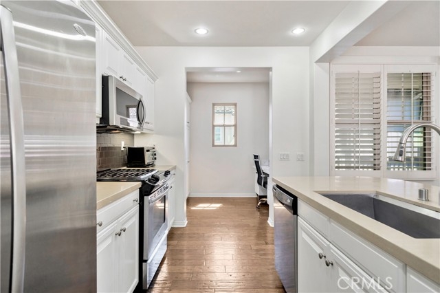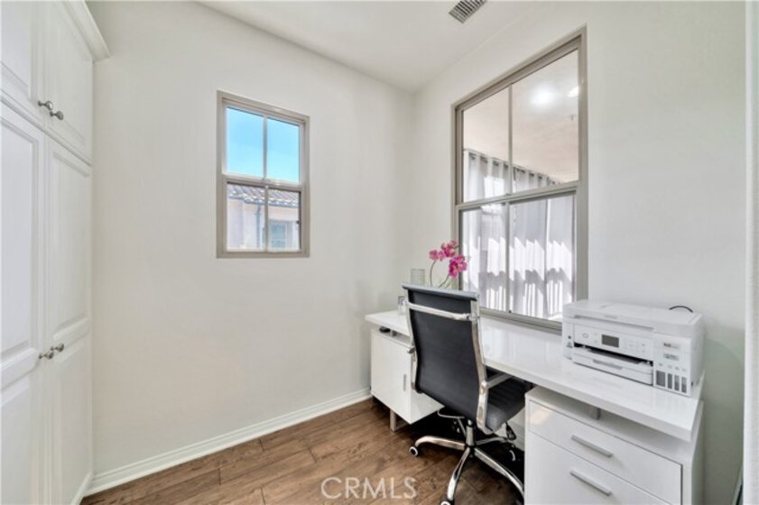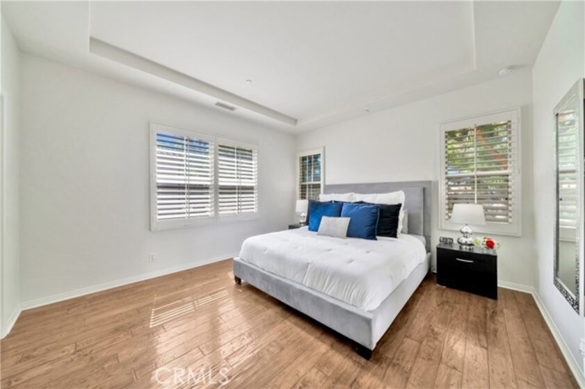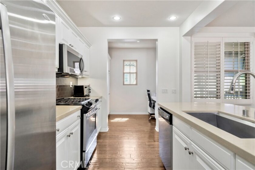 BEST VALUE IN WOODBURY, IRVINE! Discover your dream home in the highly sought-after Monterey community of Woodbury, where modern design and effortless comfort create the perfect lifestyle. This beautifully upgraded residence offers a bright, open floor plan enhanced by rich hardwood floors, elegant plantation shutters, and fresh designer paint that give the home both warmth and sophistication. At the heart of the home is a chef-inspired kitchen featuring crisp white cabinetry, a sleek subway tile backsplash, a center island with bar seating, and a charming dining nook that opens to a private balcony—ideal for casual meals or morning coffee. A dedicated tech center provides the perfect workspace for remote work or study, while the spacious living area is filled with natural light and finished with recessed lighting and stylish details. The primary suite serves as a serene retreat with a generous walk-in closet and a tastefully remodeled en-suite bath complete with dual sinks, stylish new flooring and a luxurious redesigned walk-in shower. A comfortable secondary bedroom with its own private bath offers flexibility for guests or family. Additional conveniences include a powder room on the main level, an in-home laundry area, a two-car attached garage with ample storage, and an energy-efficient tankless water heater. Life in Woodbury means enjoying resort-style amenities surrounded by beautifully manicured landscapes. Residents have access to sparkling pools and spas, a welcoming clubhouse, tennis and sports courts, and scenic parks, all within a community served by award-winning Irvine schools. Just minutes away, you’ll find the Woodbury Town Center, Irvine Spectrum, UC Irvine, golf courses, hiking and biking trails, and the region’s world-class beaches. This is an exceptional opportunity to experience the very best of Southern California living in one of Irvine’s most desirable neighborhoods. Your dream home awaits in Woodbury.