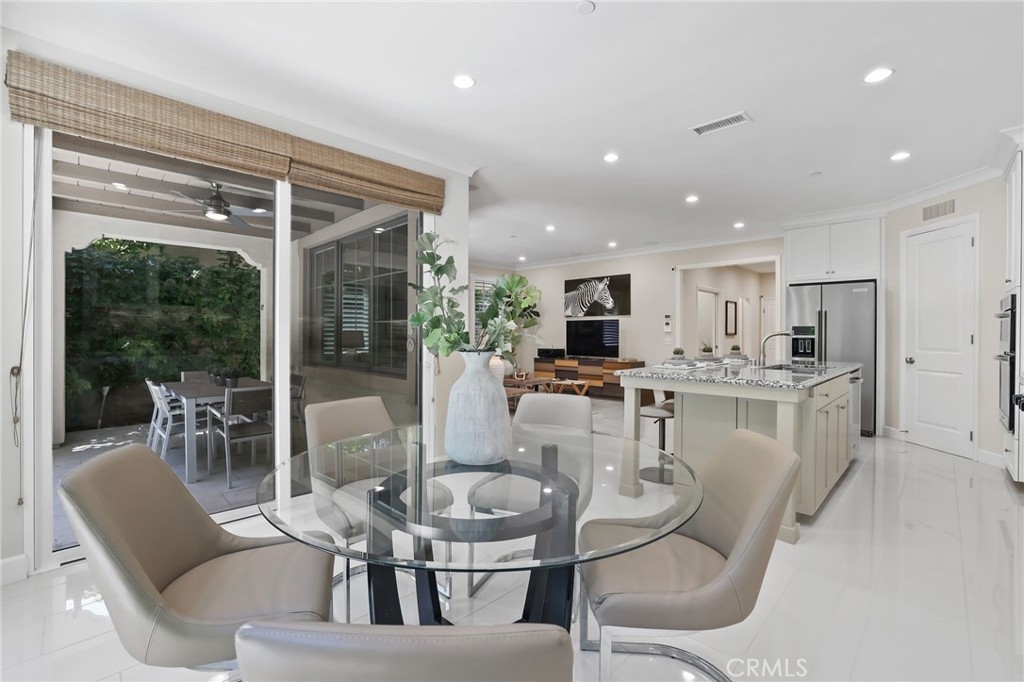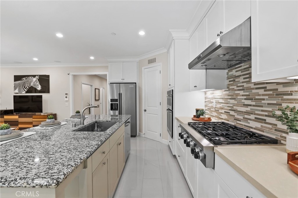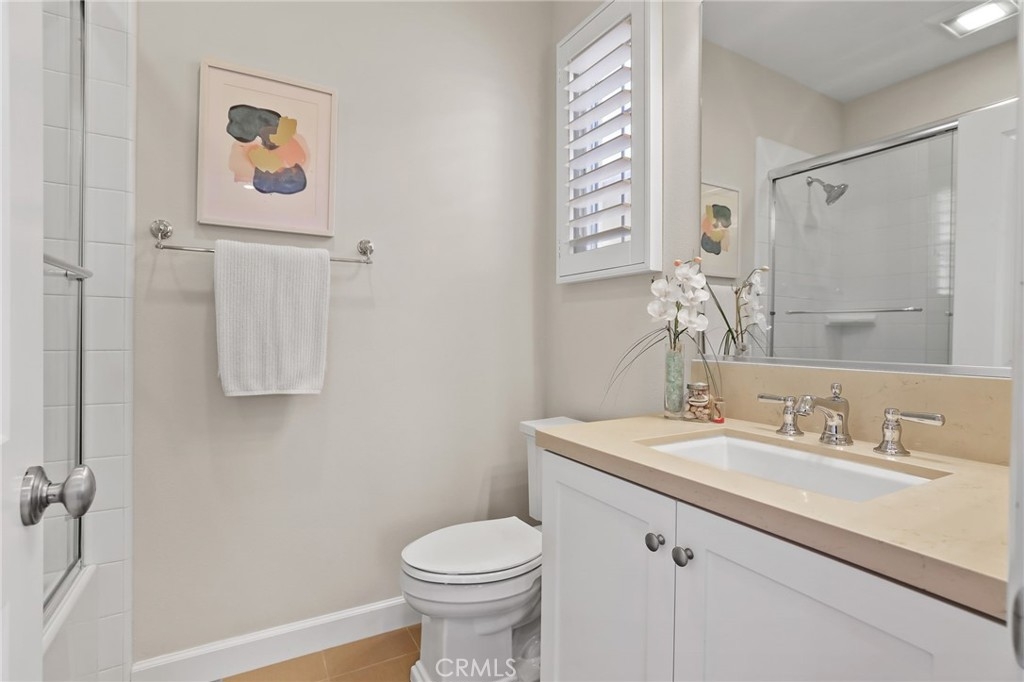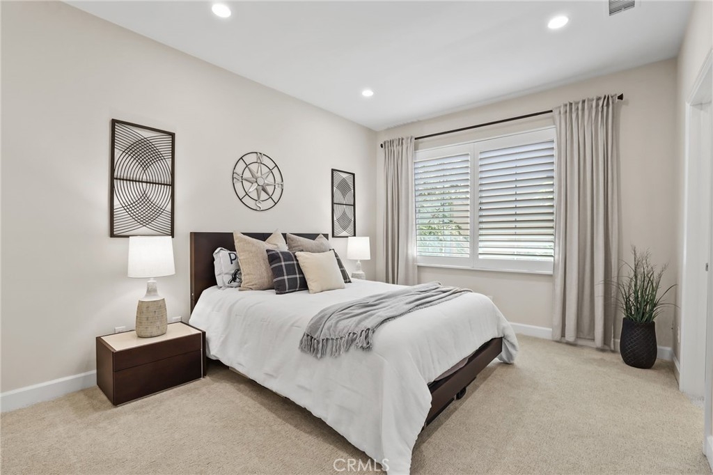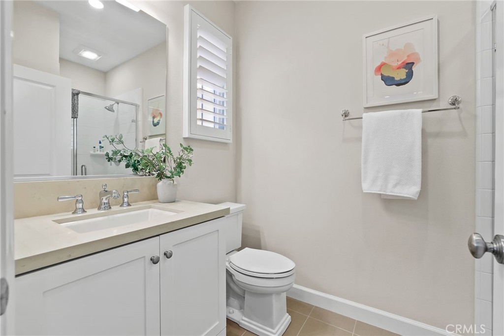Discover this stunning four-bedroom, four FULL bathroom home with a spacious loft, ideally located on a rare corner lot with an extended driveway that adds both privacy and curb appeal. Bright and inviting, the living room features large windows, recessed lighting, elegant crown molding, and sleek tile flooring. Perfect for relaxing or entertaining, it flows seamlessly into the open-concept layout. The kitchen boasts a spacious granite island with bar seating, stainless steel appliances, walk in pantry, and sleek white cabinetry with glass uppers and a modern mosaic backsplash—both stylish and functional. Just off the kitchen, the dining area is filled with natural light from sliding glass doors that open to the lush backyard, creating an ideal space for casual meals or hosting guests. The expansive and well-designed floorplan includes a convenient first-floor bedroom or office with an adjacent full bath—perfect for guests or a dedicated workspace. Upstairs, you’ll find three generously sized bedrooms, each with its own private bathroom, offering comfort and flexibility for every member of the household. A flexible loft can be used as a media room, play area, or cozy second living space. Retreat to the luxurious master suite, complete with dual sinks, a soaking tub, and a separate walk-in shower. Additional highlights include energy efficient solar panels and Tesla battery that are COMPLETELY PAID OFF and custom built in garage cabinets. Enjoy outdoor living in the private, beautifully landscaped backyard featuring a spacious California Room with ceiling fan, perfect for dining or relaxing. Surrounded by lush greenery and mature hedges, the space offers total privacy and a peaceful retreat. Located in the highly desirable Orchard Hills community, residents enjoy access to resort-style amenities including two sparkling pools, a clubhouse, playgrounds, and sports courts. All of this, just a short stroll to Orchard Hills Village Center with convenient access to shopping, dining, and more. This rare gem is an exceptional opportunity you don’t want to miss!