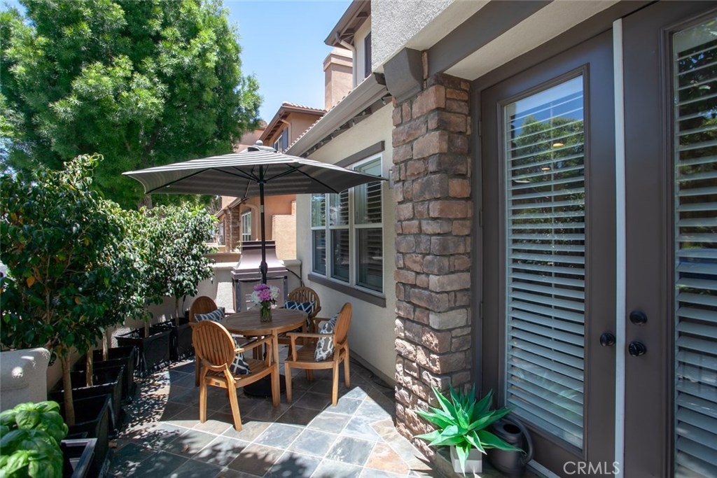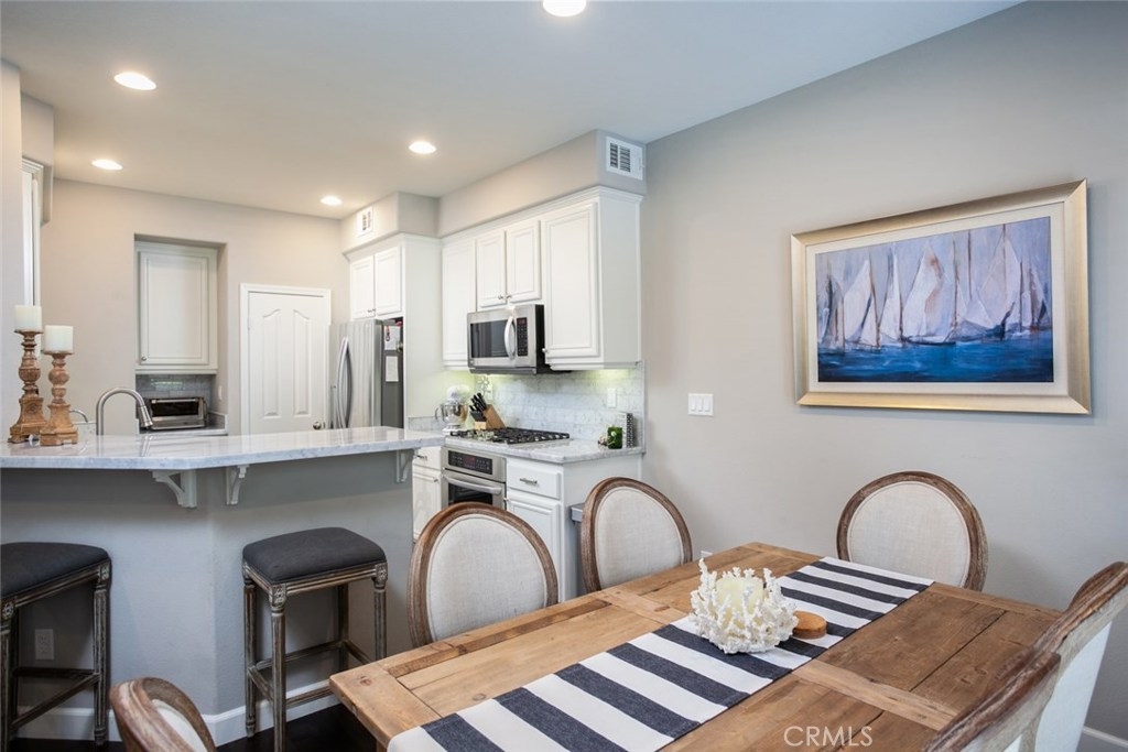 Exceptional Turnkey 3bd Townhome with over $65,000 in recent upgrades throughout! Private and quiet end unit location just minutes to Tustin Marketplace and walking trails. Designer color tones throughout in this light & bright open flowing floor plan with incredible attention to detail at every turn! Enter the first level living room featuring refinished fireplace with custom textured mantel, built-in entertainment center and beautiful hardwood floors with plantation shutters. Gourmet kitchen for the Chef at heart featuring Carrara marble counters tops and backslash, all new stainless steel appliances, walk-in pantry, all new custom restoration hardware, split sink and goose neck faucet, breakfast bar with extra large 14" marble counter top great for entertaining. Gorgeous master retreat has spa like bath featuring entire master shower with marble top tub that has wainscoting and glass enclosure, wood tile, dual vanities, custom lighting and faucets, walk-in closet and more! Loft office has built-in desk, bay window & window seating, new linen tile flooring in laundry room and guest bath. French doors lead to slate patio with gas line for outdoor grilling and cozy seating area. LED lights on dimmers, newer plush carpet, Honeywell touch screen heating & air system, alarm system, surround sound, direct 2 car garage with storage. Close to community parks, pool & spa + tennis courts, walk to award winning Myford Elementary School.