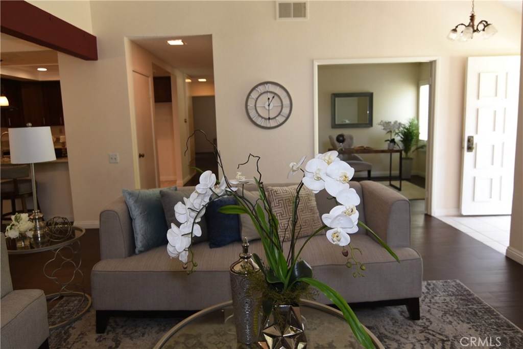 This Bright and Spacious Single-Story End Unit Condominium is situated in the peaceful community of Sundance Park. It is adjacent to Blue Ribbon Award-winning Santiago Hills Elementary School, within walking distance to Sierra Vista Middle School and minutes of drive to Northwood Highschool. This beautiful home features 3 Bedrooms and 2 Full Bathrooms. The 3rd bedroom has double doors that make it ideal for a home office, den, or guest bedroom. Sky light and double sink vanity in both bathrooms. A private patio area off the master bedroom leads to a garage. A small patio fenced by birds of paradise and bougainvillea off the dining area, which is the best place for a grill for BBQ. Laminate Flooring throughout Living Area. Bright and Light Cathedral High Ceiling Living Room, Formal Dining Room, Spacious and Open Gourmet Kitchen, Granite Counter Top, European Oak Kitchen Cabinets, Breakfast Area. Living Room with Cozy Fireplace, Huge two-car garage, and more. BEST location in the community--directly adjacent to association pool. Easy access to Jeffrey Trail, Peter’s Canyon, Irvine Regional Park, Freeways, and Shopping Centers.