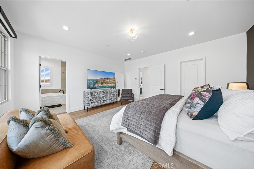 Experience elevated living in this beautifully upgraded home offering exceptional privacy with no common walls—providing the feel of a detached residence. Featuring 3 bedrooms and 3.5 baths, the home is filled with natural light and designed for modern living. The open-concept layout showcases designer finishes and high-end luxury vinyl plank flooring throughout. The remodeled kitchen features quartz countertops, stainless steel appliances, and custom cabinetry. Each bedroom includes its own en-suite bath for maximum comfort and convenience. The spacious primary suite offers a spa-inspired bathroom and ample closet space. Additional highlights include a guest powder room, central A/C, recessed lighting, and a private patio. A rare turnkey opportunity combining style, comfort, and a prime location near top-rated schools, shopping, dining, and easy freeway access.